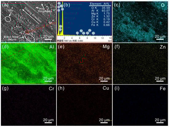 The SEM image of the worn surface of the untreated surface sample after tribological testing is shown in Figure 7a. Numerous tiny scratches, along with a few pits, appeared on the surface. The scratches were parallel to the sliding direction. Thus, it could be concluded that the wear mechanism of the Al alloy surface was mainly abrasive wear, accompanied by adhesive wear. In addition, a great number of flocculent particles which were the aforementioned black debris mainly consisting of O and Al as suggested by EDS analysis (Figure 7b) and element distribution of the worn surface (Figure 7c–i) were distributed at some locations on the worn surface. It appeared that some of wear debris that did not depart from the friction zone was crushed by the steel ball repeatedly. In the meantime, due to the frictional heat, the particles were gradually oxidized, leading to the formation of black flocculent particles.