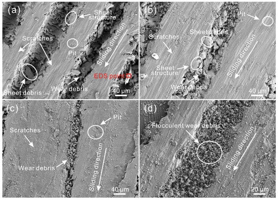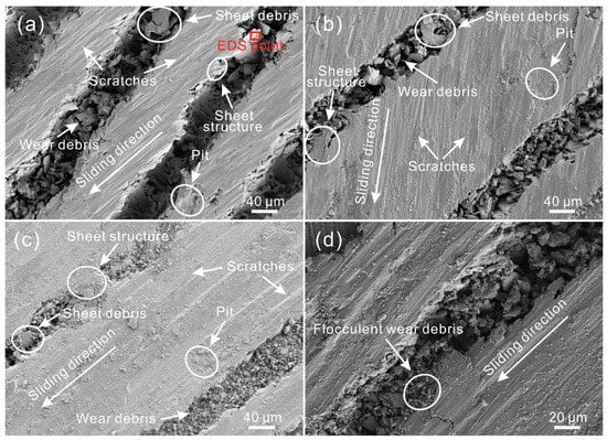 Figure 8 shows SEM images of the worn surface of the LGS after testing. As shown in Figure 8a, the width of the worn zone was much larger than that of the strip convex structure of the LGS (texture spacing of 150 μm). Under a low sliding speed (100 mm/s), scratches and pits could be found on the worn surface, indicating that the wear mechanism was identical to that of the untreated surface. However, compared with the untreated surface, the worn surface of the LGS was smoother, and the scratches were smaller. Additionally, numerous irregular tiny wear debris could be observed in the grooves. As shown in Table 4, the composition of the worn surface and wear debris in the grooves were similar. The wear debris can be captured by the grooves, which can significantly decrease the degree of abrasive wear. Flocculent black wear can be prevented as well. Furthermore, the micro-sheet structure was seen at the edge of the strip convex structure of the worn surface. Meanwhile, sheet-like debris of a large size could be observed in the grooves. Thus, it could be concluded that the structure at the edge of the convex structure was flattened out by the steel ball. Meanwhile, because of the plough-effect of the steel ball, the flat structure was cut and fell into the groove. The results indicate that the wear at the edge of the convex structure of the LGS was not induced by the plough-effect of wear debris, but by that of the steel ball. This discovery results in a new understanding of the wear mechanism of Al alloy micro-scale structure surfaces. From the SEM image of the worn surface of the LGS presented in Figure 8b, we can see that as the texture spacing increased to 250 μm, a similar phenomenon could be seen because of the same wear mechanism. However, the wear debris in the grooves was smaller than before, indicating that the capturing debris effect of the roughness structure was weakened due to the decrease of the distribution density of the concave structure (groove) of the LGS. This led to an increase in the time that wear debris stayed at the friction zone. As shown in Figure 8c, when the sliding speed rose to 400 mm/s, the worn surface of the LGS with a texture spacing of 250 μm underwent almost no change. Thus, the wear mechanism of the LGS was mainly abrasive wear under a high sliding speed. Owing to the increase in the time that wear debris was crushed by the steel ball per unit time, the scratches on the worn surface and wear debris in the grooves became smaller. From the SEM image of the worn surface of the LGS with a texture spacing of 350 μm, shown in Figure 8d, we could see that a small amount of black flocculent wear debris could be found in the groove, which further proved that the increase of texture spacing would weaken the capturing wear debris performance of the LGS.