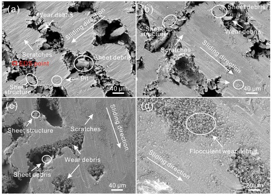Figure 15. SEM images of the worn surface of the AGS with a texture spacing of (a) 150 μm, (b) 250 μm (load of 0.3 N, sliding speed of 100 mm/s, frictional pair of GCr15 bearing steel); (c) SEM image of the worn surface of the arc groove surface with a texture spacing of 250 μm (sliding speed of 400 mm/s); (d) SEM image of black wear debris on the worn surface of the AGS with a texture spacing of 350 μm (sliding speed of 400 mm/s).