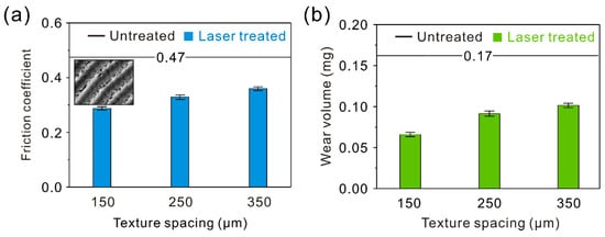 Figure 12. (a) Curve of the dynamic friction coefficient of the AGS with different texture spacings; (b) wear volume of the AGS with different texture spacings (load of 0.3 N, sliding speed of 100 mm/s, frictional pair of GCr15 bearing steel, friction time of 10 min).
