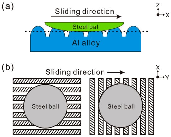 Based on the aforementioned results, the improvement effect of the micro-scale structures on the Al alloy’s tribological properties was based on three factors. The arc convex structure and concave structure of the AGS were parallel to the sliding direction during tribological testing. As shown in Figure 13, compared with the strip concave structure that was perpendicular to the sliding direction, the concave structure of the AGS could not only decrease the real contact area, but also weaken the ploughing effect induced by the steel ball, which greatly reduced the production of wear debris. Thus, the tribological properties of the Al alloy could be dramatically improved by arc grooves. As the texture spacing increased, the aforementioned influence of the concave structure of the AGS decreased significantly, resulting in aggravation of friction and wear. In addition, owing to running in the same direction, arc grooves could not remove wear debris away from friction zone, but rather captured wear debris during the friction process.