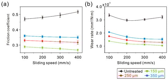 As suggested by Table 2, the distribution densities of the convex structure and the concave structure of the LGS with a texture spacing of 150 μm were almost consistent with those of the GGS with a texture spacing of 250 μm. From the friction coefficient and wear rate of two samples against a steel ball friction pair at a constant sliding speed of 100 mm/s and load of 0.3 N for 10 min, as shown in Figure 16, it was observed that, compared with the GGS, the friction coefficient and wear rate of the LGS were a little higher. From the friction coefficient and wear rate of two samples shown in Figure 16 (test conditions: steel ball friction pair, load of 0.3 N, sliding speed of 100 mm/s, 10 min), the friction coefficient of the samples was not considerably different. Nevertheless, the wear rate of LGS (1.68 ± 0.040 × 10−3 mm3/N∙m) was lower than that of GGS (1.98 ± 0.064 × 10−3 mm3/N∙m). Due to their similar surface hardness, this indicated that the capturing wear debris performance of linear grooves was much better than that of gridding grooves during the friction process. This was due to the ability of the linear groove to remove wear debris away from the friction zone. However, the difference of the friction coefficient or wear rate between the samples was not large, showing there was little effect from the capturing of wear debris on the tribological properties of the Al alloy under a low sliding speed. When the sliding speed was low, the movement of the wear debris was slow during the friction process, leading to a poor performance in capturing wear debris by the groove. Therefore, it could be concluded that the improvement effect of the micro-scale structure on the tribological properties of the Al alloy was mainly due to the reduction of the real contact area induced by a concave structure under a low sliding speed.