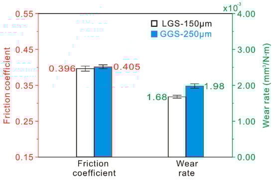 Figure 16. Friction coefficient and wear rate of the LGS with a texture spacing of 150 μm and GGS with a texture spacing of 250 μm (load of 0.3 N, sliding speed of 100 mm/s, frictional pair of GCr15 bearing steel, friction time of 10 min).