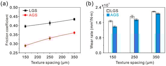 Figure 17. (a) Friction coefficient and (b) wear rate of the LGS and AGS with different texture spacings (load of 0.3 N, sliding speed of 100 mm/s, frictional pair of GCr15 bearing steel, friction time of 10 min).