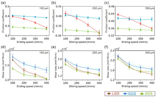 The friction coefficient and wear rate of the micro-scale structure surface samples with different texture spacings under different sliding speeds are exhibited in Figure 18 (friction pair of steel balls, load of 0.3 N, friction time of 10 min, room temperature). Obviously, the friction coefficient of the AGS was the lowest, showing the influence of the weakening of the ploughing effect on the tribological properties (Figure 18a–c). Furthermore, as shown in Figure 18a, though the distribution density of the concave structure of the GGS (150 μm) was much lower than that of the LGS (150 μm), the LGS had a lower friction coefficient. This result further indicated that the effect of micro-scale structure with low distribution densities (less than 40%) on the tribological properties was mainly due to the improvement of surface hardness. However, when the distribution density of the concave structure of the micro-scale structure surface was high (more than 40%), due to the improvement of the effect of decreasing the real contact area induced by the concave structure, the friction coefficient of the GGS was lower than that of the LGS (Figure 18b,c). As the sliding speed increased, the friction coefficient of the LGS showed a significant decrease, and rapidly approached the value of the AGS. This indicated that an increase of sliding speed could improve the performance and effect of capturing wear debris of the concave structure of the micro-scale structure surface, which could remove wear debris away from the friction zone very effectively. From the variations of the wear rate of the micro-scale structure surface samples with the sliding speed shown in Figure 18d–f, a similar phenomenon could be seen. Clearly, the difference of the wear rate between the AGS and LGS reduced dramatically with the increase of sliding speed, which further proved that the capturing wear debris performance of the concave structure was affected by the sliding speed. Moreover, it indicated that the LGS had better tribological properties than other surfaces under a high sliding speed.