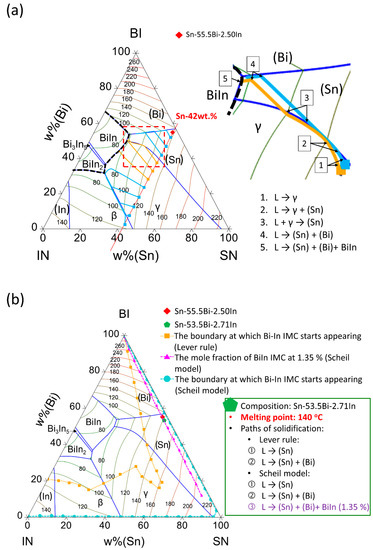 The two goals for improving the conventional binary Sn-Bi eutectic solders are clearly defined in the alloy design at the first place, namely (1) enhancing the elongation property, while (2) keeping the melting (liquidus) temperature below 140 °C. In order to optimize the alloying mount of In content in the Sn-Bi-In solder, the solidification behavior of entire Sn-Bi-In ternary compositional space was evaluated with a similar process, i.e., checking the solidification paths of alloys with various Bi/In ratios with fixed Sn contents every 6 wt.% Sn as an interval. As shown in Figure 2b, the compositional threshold of formation of Bi-In IMCs during solidification was evaluated based on the lever rule and the Scheil model, and the boundaries of Bi-In IMC formation during solidification based on both solidification models were superimposed on the Sn-Bi-In liquidus projection as the orange dotted line and the light blue dashed line, respectively. For the equilibrium condition based on the lever rule (orange dotted line), a quite broad compositional area could meet the criterion of no Bi-In IMC precipitation; however, for the non-equilibrium condition based on Scheil model (light blue dashed line), only a very narrow window near the Sn-In and Sn-Bi binary boundaries could meet this criterion. Since the alloy solidification in real soldering processes should lie between these two extreme cases, the optimal alloying level should also lie between the two boundaries when considering the finite rate of diffusion. As reviewed in the Introduction section, a trial-and-error experiment suggested that the Sn-55.5Bi-2.5In solder could fulfill elongation requirement without the formation of the brittle Bi-In IMCs [16]. Therefore, this proposed composition was taken to perform solidification calculation based on the Scheil model, and the resultant final solidified phases consisted of 1.35% BiIn. This suggests that 1.35% BiIn phase in Scheil solidification can be considered as the optimal alloying level with the most intake of In in the solidified solution phases without Bi-In IMC formation in reality. With the 1.35% BiIn in Scheil solidification being the criterion to meet the first goal on elongation, as shown in Figure 2b, the pink dashed line superimposed on the Sn-Bi-In liquidus projection illustrates the desired In-alloying levels. Then, with the consideration of the other goal of a 140 °C melting temperature, the nominal composition of the desired solder was proposed to be Sn-53.5Bi-2.71In as shown in Figure 2b.