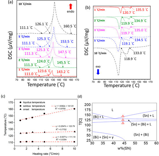 The melting temperature and the solidification behavior are critical characteristics for low-temperature solders. As shown in Figure 3a,b, the proposed SBIG quaternary alloy was subjected to thermal analyses using a DSC with various heating and cooling rates at 1, 2, 3, 5 and 10 °C/min, respectively. Prior to each heating process, the sample was equilibrated at 100 °C for 72 h to ensure the initial equilibrium condition, and for a similar reason, the sample was held at 170 °C for 5 min prior to each cooling process.