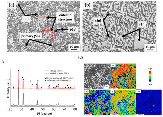 Figure 4a,b shows the microstructures of as-cast SBIG and Sn-58Bi alloys prepared by air cooling, respectively. For the as-cast SBIG alloy, the bright, grey, and dark regions under the backscattered electron (BSE) detector are the Bi-, Sn-, and Ga-rich phases, respectively. The composition of Ga-rich phases was determined to be Sn–4.11 wt.% Bi–0 wt.% In–92.59 wt.% Ga using energy dispersive spectroscopy (EDS). A similar phase formation was found in the as-cast Sn-58Bi alloy except for the dark Ga-rich phase. Comparing the microstructures, much finer grains and more Sn-rich phase were found in the SBIG solder than in the Sn–58Bi solder. Figure 4c shows the X-ray diffraction (XRD) pattern of the as-cast SBIG alloy. The major phases are the (Bi) and (Sn) phases, which is in accordance of the observation in BSE microstructure. Since there is no IMC in the Ga–Sn, Ga–Bi, and Ga–In binary systems, the minor Ga-rich phase observed in SBIG was likely an unreacted (Ga) phase, which is a liquid phase at room temperature and is invisible in the XRD analysis. The three phases presented in the SBIG alloy are all elementary phases, namely the (Sn), (Bi), and (Ga) phases. The elemental-mapping analysis of SBIG is shown in Figure 4d. It was found that Sn essentially does not dissolve in the (Bi) phases; however, In and Ga are partially dissolved in the (Bi) phase. In addition, there are some amounts of In, Ga, and Bi dissolved in the (Sn) phase. Bi-rich phase contains some part of In and Ga. The (Ga) phase distributes in between the major (Sn) and (Bi) phase regions in terms of micron to submicron regions. The proposed SBIG exhibits similar phases as the eutectic Sn-Bi alloy except for well-distributed (Ga) micro-regions and much finer grains in the solder matrix.