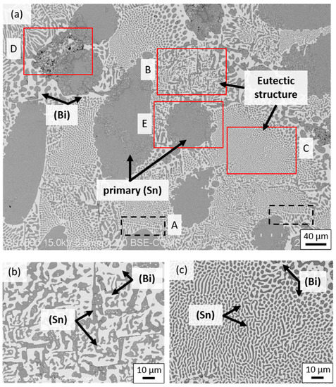 - The microstructure of the proposed SBIG solders was significantly different from the conventional eutectic Sn-58Bi solder, which is composed of the primary (Sn) phase, the (Sn)+(Bi) eutectic structures, and minor sub-micron to micron (Ga) phase.
