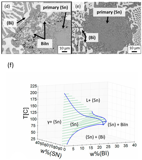 (a) The SEM images of the “step-quenched” SBIG alloy. The close-ups at the (b) coarse eutectic, (c) fine eutectic, (d) BiIn IMC, and (e) primary (Sn) phase regions. (f) The three-dimensional (3D) space diagram of the single (Sn) phase region in the Sn-Bi-In ternary system.