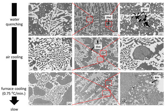 The designed Sn–52.5Bi–2.68In–1Ga alloy (in wt.%) was prepared with a commercially available Sn–58Bi alloy (99.95%, Alfa Aesar, Tewksbury, MA, USA) and pure Sn (99.99%, Alfa Aesar, Tewksbury, MA, USA), In (99.9%, Alfa Aesar, Tewksbury, MA, USA) and Ga (99.9%, Alfa Aesar, Tewksbury, MA, USA). Proper amounts of the constituent materials were weighted and homogenized at 400 °C in the alumina crucible for 50 h under the protection of high-purity argon atmosphere and then cooled down in the high-purity argon atmosphere. After homogenization, the alloys were subsequently remelted at 250 °C for 1 h before casting. The alloys were cast with water quenching, air cooling, and furnace cooling, respectively, for investigating the effect of cooling rates. Some of these as-cast solder bulks were subsequently immersed in an oil bath at 80 °C for 504 h for thermal aging studies.