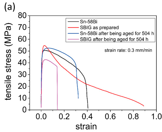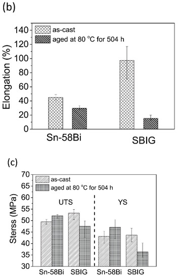 Figure 8a shows the stress-strain (SS) curves of the as-cast and 80 °C-annealed eutectic Sn–58Bi and SBIG samples in tensile tests, respectively. The SS curve of the as-cast SBIG was not uniform after the load reached UTS; this can be attributed to the minor Ga-rich liquid phase retained in the as-cast SBIG alloy. Nevertheless, the elongation, ultimate tensile strength (UTS), and yield strength (YS) of the four samples can be obtained from the SS curves and summarized in Figure 8b,c, respectively. As shown in Figure 8b, the elongation of as-cast SBIG and Sn–58Bi are 97.3% and 37.5%, respectively. The elongation of SBIG is more than doubled larger as compared with that of Sn–58Bi solders. However, the elongation of both samples decreased after thermal ageing, especially for SBIG. As shown in Figure 8c, the UTS and YS of as-cast SBIG samples are slightly higher those of as-cast Sn-58Bi samples; however, the UTS and YS of 80 °C-annealed SBIG samples become much lower those of Sn-58Bi samples after aging.