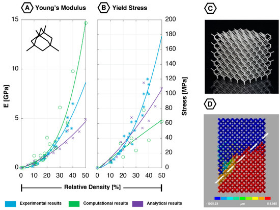 When comparing the analytical, computational, and experimental data on the diamond lattices, one finds that the results obtained using these different approaches correspond very well for all mechanical properties (Young’s modulus, yield stress, first maximal stress), especially for low values of relative density (i.e., below 25%) (Figure 1).