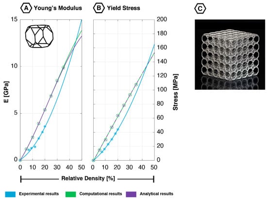 Mechanical properties of the truncated cube unit cell based on experimental, computational, and analytical studies: (A) Young’s modulus [18,19]; (B) yield stress [18,19]; (C) additively manufactured truncated cubic lattice (5 × 5 × 5 unit cells).