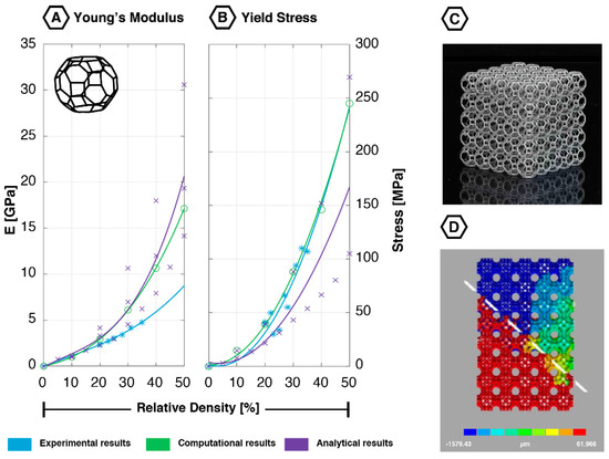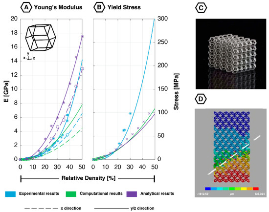 The data obtained using computational and experimental techniques corresponds very well for both the first maximal stress and yield stress (for small relative densities in Figure 2) [12,44,45,47,48,49,52]. However, large deviations were found in the analytically obtained values. Regarding the Young’s modulus, both computational and analytical data do not correspond well with the experimentally obtained values (Figure 2).