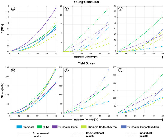 Young’s moduli (A–C) and Yield stresses (D–F) of all five unit cells based on experimental, computational, and analytical data. Since the rhombic dodecahedron is anisotropic, two lines have been displayed showing its properties in the x- (dashed line) and y-/z-directions. (A) [12,18,33,34,35,36,37,39,44,45,47,48,49,50,51,55]; (B) [19,33,39,40,41,42]; (C) [19,21,33]; (D) [12,18,33,34,36,37,38,40,47,48]; (E) [19,22,40]; (F) [19,21,33].