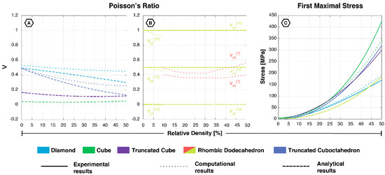 (A) Poisson’s ratio of the diamond, cube, truncated cube and truncated cuboctahedron and (B) rhombic dodecahedron; (C) first maximal stress of all five unit cells, based on experimental [12,18,33,34,35,36,37,39,44,45,47,48,49,50,51,55], computational [19,22,33,40,42], and analytical data [19,21,22,33].