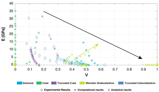 Young’s modulus versus Poisson’s ratio for all of the studied unit cells based on experimental, computational, and analytical data [19,21,22,33,35,42,46].
