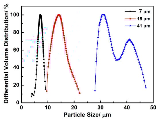 Commercial fine and coarse α-SiC powders (purity > 99%, Pingdingshan Yicheng New Material Co., Henan, China) were graded and used as the main materials: Fine ones with average particle sizes of ~0.5 μm, and three types of coarse ones with average particle sizes of ~7, ~15 and ~41 μm respectively. The particle size distribution curves of coarse α-SiC powders are shown in Figure 1. The Commercial Al2O3 powder (~1.5 μm, Fenghe Ceramic Co., Ltd., Shanghai, China) and Y2O3 powder (~0.8 μm, Dafeng Yuelong Chemical Co., Ltd., Yancheng, China) were added as sintering aids for the porous L-SiC ceramic. Al2O3/Y2O3 powders were directly used without any treatment and pre-mixed according to the mass ratio of 78:97 before the preparation of porous L-SiC ceramics.