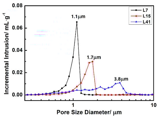 Pore size distribution of porous L-SiC ceramics with different particle sizes of the initial coarse SiC powder.