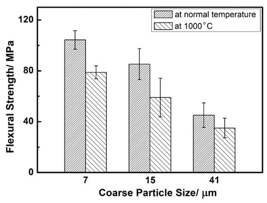 At the temperature of 1000 °C, the flexural strengths of porous L-SiC ceramics also decreased with the increase of coarse particle size. The flexural strengths of L7 (78.8 ± 5.1 MPa), L15 (59.0 ± 15.2 MPa), and L41 (35.0 ± 7.7 MPa) at 1000 °C were about 76%, 69%, and 78% of those at room temperature, respectively. A slight decline in high-temperature strength was mainly attributed to the softening of the neck between particles formed by liquid phase sintering and probably the rapidly rising temperature rate (200 °C·min−1) during the test procedure.