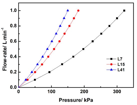 Considering the above-mentioned applications of porous SiC ceramics, such as catalyst supports, gas burner media, high-temperature filters and so on, gas permeability is the key property used to measure their work efficiency. Figure 6 shows the dependence of flow-rate on nitrogen pressure and coarse particle size. The porous L-SiC ceramic with the coarse particle size of ~41 μm presented the sharpest increase in flow rate with the rising of nitrogen pressure, indicating that it had relatively high gas permeability (4.6 × 10−14 m2). The slopes of the flow-rate indicated a gradual decrease in gas permeability of the porous L-SiC ceramic with a decreased particle size of the coarse SiC. The gas permeabilities of L7 (1.4 × 10−14 m2) and L15 (2.5 × 10−14 m2) were 70% and 46% lower than that of L41. The gas permeabilities of porous L-SiC ceramics were associated with pore microstructures and their relationship can be described according to the following Carman-Kozeny’s equation: