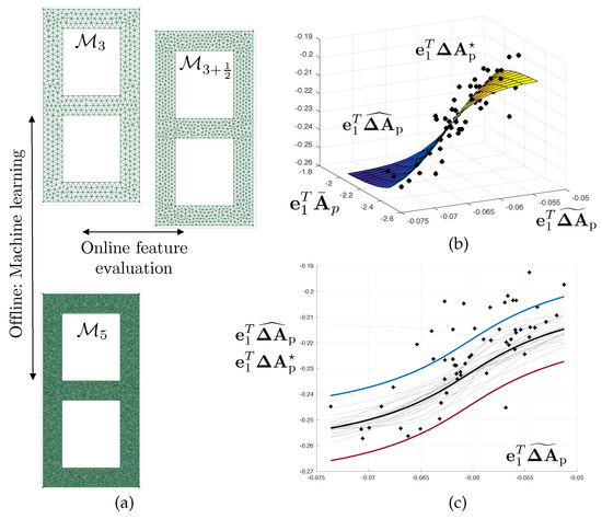 In grey colours, we report evolution of for the coarse scale (light grey), consistently with the derivations of the previous section, but also, for reference, a similar statistics constructed with the corrected finite element model (dark grey). Both curves have similar evolutions and, of course, tend to 0 as n tends to infinity. We set , and . This means that the statistical error is considered small enough once the blue line (lower limit of the bootstrap CI for ) is above the 95th percentile of . Here, “small enough” is to be understood, as small enough for a decision regarding the need to refine the mesh one step further to be taken.