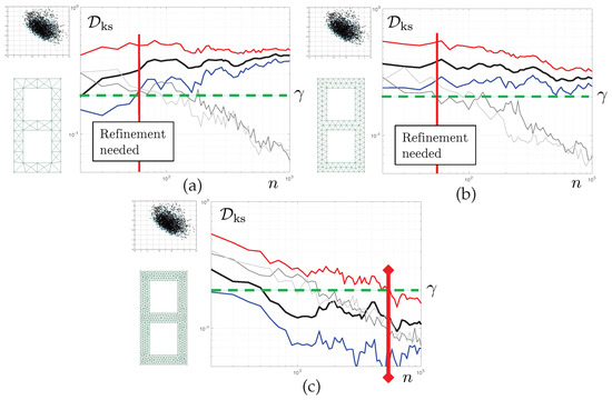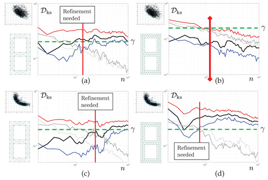 Notice that the use of a larger percentile Z yields a less conservative indicator for the need for mesh refinement, which can be compensated by decreasing p-value . The criterion that is arguably the easiest to interpret is , where is directly the KS distance (i.e., computed without bootstrapping).