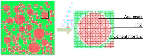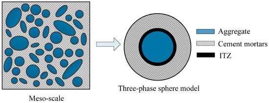 It is well known that concrete is a multi-phase heterogeneous brittle material. The mechanical properties of concrete are determined by components in its mixture. In this paper, concrete is described as a three-phase composite material at the meso-level, composed of coarse aggregates, cement mortar, and an ITZ between both phases. With the spherical aggregate applied, the microstructure in concrete can be depicted as in Figure 3. In the model only coarse aggregates with a particle size greater than 5 mm are represented clearly, while the other smaller aggregates are mixed up in the cement paste matrix.