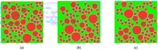 According to the theory of Fuller’s maximum density curve, three representative diameters (10 mm, 20 mm, and 32.5 mm) of aggregates are selected to calculate number of aggregate particles. The numbers are, respectively, 66, 11, and 3, as obtained from Equation (20). The aggregates calculated are put into the two-dimensional region, the same size as concrete specimen, by using the Monte Carlo method with three sets of different random numbers. Each aggregate should be in line with the boundary conditions and not overlap with the other aggregates before it is put on. The modeled aggregates are shown in Figure 4.