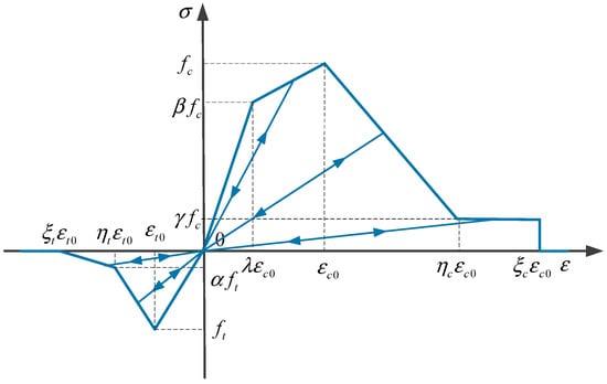 As known, the mechanical properties of microscopic components have a great influence on the fracture damage behavior of concrete. Therefore, the heterogeneity of concrete should be taken into account in this numerical simulation. In this paper, concrete can be treated as a three-phase composite material composed of coarse aggregate, cement mortar, and the ITZ. Each phase material in concrete is assumed to be homogeneous and isotropic. The constitutive relation is presented in Figure 6. The maximum principal stress criterion is applied as the failure criteria in the study. The reduction of the elastic modulus of the material in the damage processes can be expressed as follows: