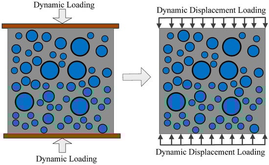 In this section, the dynamic test of concrete subjected to uniaxial compressive loads is simulated with the BFEM. A standard concrete specimen, with the dimensions 150 mm × 150 mm, is chosen to conduct the test. The particle diameter of the coarse aggregates ranges from 5 mm to 40 mm. The boundary conditions are shown in Figure 7. The bottom and top surfaces of the specimen are restricted only in the y-direction; other surfaces of the specimen are free in all directions. The influence of friction between the specimen and the loaded end on the compressive strength of concrete is ignored.