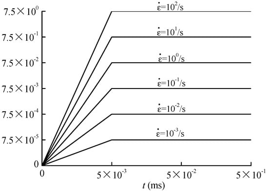 in which is the dynamic uniaxial compressive strength and is the quasi-static uniaxial compressive strength; is the quasi-dynamic strain rate and is the quasi-static strain rate; is the quasi-static uniaxial compression strength and . It should be noted that and . As known from the empirical formula, the value of is 1 when the strain rate is , which is called the quasi-static load modal. In this paper, the minimum strain rate is deemed as the quasi-static strain rate for comparison. According to the previous study, the strain-rate sensitivity of concrete characteristics, such as the Poisson’s ratio, elasticity modulus, energy dissipation capacity, and so forth, are much lower than the tensile and compressive strength of concrete [55].