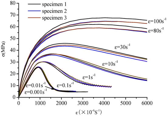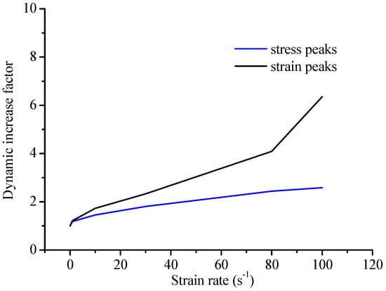 The stress–strain curves are similar to the static at low strain rates from to and the compressive strengths present a small enhancement. However, at the high strain rates from to , the curves slow down gradually as the strain rate increases and the stress peak and strain peak increase significantly, and especially the ratio of dynamic compressive strength at the rate of to the static compressive strength is about 2.67. It is also found that the increasing trend of the strain is more prominent than that of the stress from Figure 10.