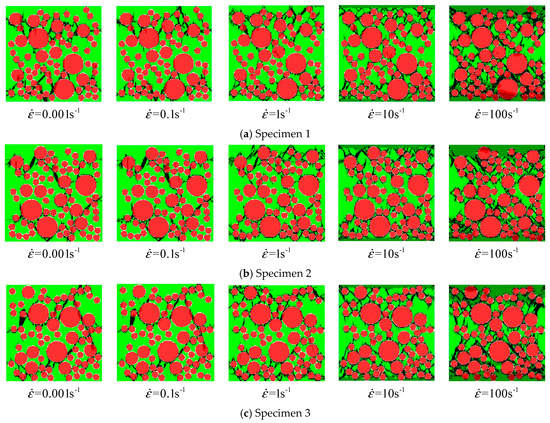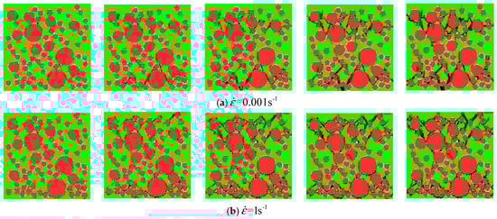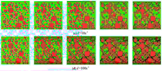 The meso-cracks first occur and spread in the ITZ, or the weak link, in cement mortar. Finally, a region is formed, filled with a concentrative zonal crack, which results in the destruction of concrete. At the high strain rates from to , the number of cracks greatly increases and the cracks are diffused through the whole concrete specimen—a few cracks even pass through the aggregate area. Coalescent cracks as a diffusion state can be seen in Figure 12. In addition, from Figure 9 and Figure 12, there is also a minor effect of the distribution of aggregates on the compressive stress. However, the distribution of aggregates can significantly affect the initiation and propagation of cracks.