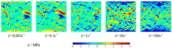The stress–strain curves of concrete specimens are shown in Figure 9. The peak values of strain and stress are shown in Figure 10 at the different strain-rates. The damage process of concrete specimens under different strain-rate compression levels is shown in Figure 11. The failure patterns at different rates are illustrated in Figure 12. The distribution of the maximum principal stress in the damaged concrete is shown in Figure 13. It is to be noted that means the strain rate, is the strain, and is the compressive stress. In Figure 13, the positive numbers represent the elements under tensile stress and the negative numbers represent the elements are under compressive stress.