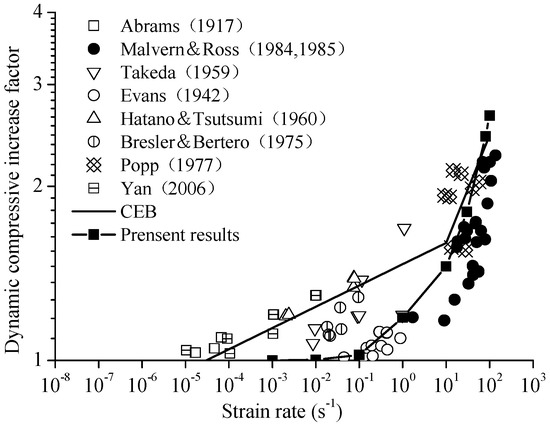 In Figure 14, it can be observed that the curve of the present result goes up precipitously at the strain rate of . The results obtained show good agreement with the Comité Euro-International du Béton (CEB) standard and other experimental data at the strain rates from to . At the strain rates from to , the DIF is lower than the CEB standard.