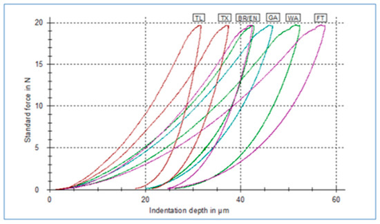 Figure 1 demonstrates representative force-indentation depth curves from all materials tested.