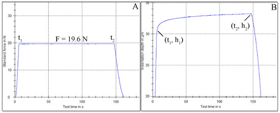 where h2 stands for indentation depth at time t2 of holding the constant test force and h1 the indentation depth at time t1 of reaching the test force which is kept constant. Three indentation depth-time curves were obtained from each specimen and the mean value was used to characterize the specimen itself.