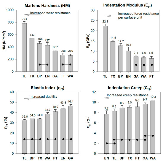 The numerical results of all mechanical properties along with the statistical outcome for statistical significant differences among materials tested are presented in Figure 3.