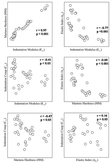 Spearman correlation reveals that HM has a positive correlation with EIT. Both properties demonstrated a negative correlation with ηIT and CIT, while no correlation was identified between ηIT and CIT (Figure 4).