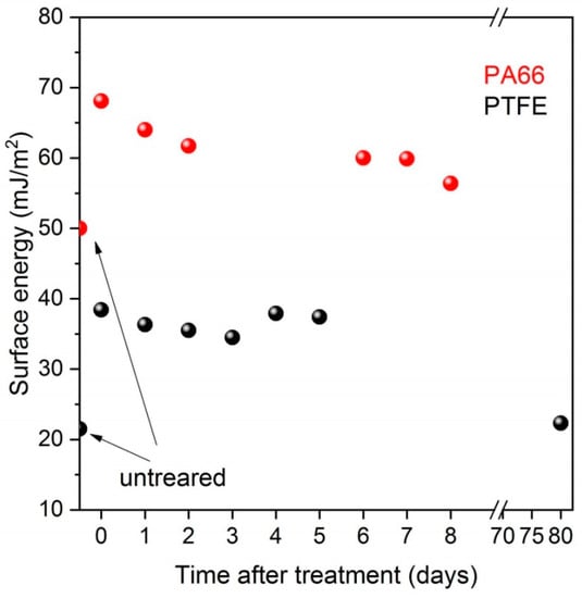 Table 2 shows the average apparent contact angle values of water and diiodomethane as well as the calculated surface energy values including both the polar and dispersive components for the pristine and DCSBD treated samples. While both investigated polymers are considered hydrophobic according to their high water contact angle values, PTFE shows an extremity among polymers with its 108° WCA value. Considerable decrease was reported in the apparent water contact angle values for a range of polymers on cold plasma treatment [30,31]. We also found that a 30 s DCSBD plasma treatment significantly decreased the apparent water contact angles from 63° to 33° for PA66, however, the overall decrease was negligible for PTFE reaching a 101° WCA. We examined the effect of plasma treatment up to 10 min for PTFE even though the efficacy of extended treatment time was doubted [29]. We found that prolonged treatment time, indeed, did not significantly improve the wettability of PA66. However, we also found that PTFE is an exception since the WCA value was gradually decreased over the treatment time to reach a final 68° after 10 min. Although, the overall decrease was significant, the PTFE remained hydrophobic that cannot be further improved by prolonged treatment. The plasma treatment time of the specimens for the adhesion and tribological tests was chosen as 30 and 300 s for PA66 and PTFE, respectively, considering the aforementioned WCA results. Parallel with the decrease of the apparent water contact angles the surface energies increased primarily due to the rise in the polar components. The effect of plasma treatment, however, is reported to vanish after longer period due to the surface reactivity and reorientation of polymer chains. We also found a gradually decreasing trend in the surface energy for both polymers in the subsequent days of the treatment (Figure 1). After 3 months of the treatment the surface energy of PTFE was completely restored to its original value.