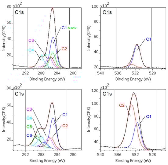 The decomposed C1s and O1s spectra of the PA66 samples are shown in Figure 2. The surface of the pristine PA66 sample, despite of a small amount of adventitious carbon and extra oxygen, was almost equivalent to those described in the literature [32]. After plasma treatment the carbonaceous contamination removed and oxygen content is significantly increased, as shown Figure 2 (lower panes) and in Table 4. The ratio of the PA66 carbon species are unchanged but two additional components (C5, C6) appeared, corresponding to carboxylic (acid, ester) environment. The increment of the oxygen (O2) can also be assigned to carboxylic groups. The concentration of nitrogen is slightly increased.
