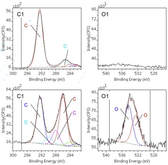 The similarly decomposed C1s and O1s spectra of the PTFE samples are depicted in Figure 3. The surface of the pristine PTFE sample is notably clean: beside a low level of hydrocarbon type contamination no oxygen could be detected. The peak positions and intensity are in full agreement with the literature data [30].
