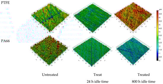 3D topography of treated and untreated specimen for PA66 and PTFE grades.