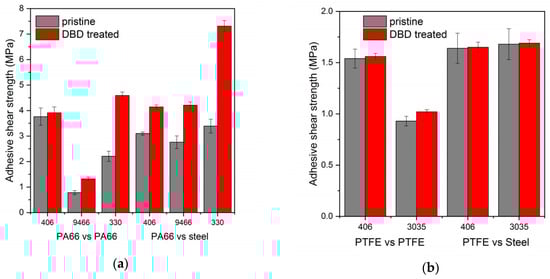 Figure 6a,b show the shear strength of pristine and DCSBD treated polymer/polymer and polymer/steel joints evaluated by lap-shear tests for PA66 and PTFE, respectively. Applying the adhesives on the untreated PA66 surfaces the obtained shear strength showed great variation. Adhesion was three times higher using a cyanoacrylate-based glue (Loctite 406) as compared to an epoxy glue (Loctite 9466). For polymer/steel joints the adhesion strength exhibited only minor variance among the applied types of adhesive. After setting all the adhesives became rigid and peeled off the surface of the PA66 polymer that is capable of significant strain. On DCSBD treatment the adhesion strength improved more or less for each types of adhesive. The highest improvement both for the polymer/polymer and polymer/steel joints occurred when a two component acrylic adhesive (Loctite 330) was employed. It seems obvious that the enhancement of the adhesion can be attributed to the higher wettability and surface polarity of the DCSBD treated polymer surfaces. In addition of the increased adhesion strength, the reliability of the joints also improved as it was indicated by the decrease of the statistical deviation of the shear strength (5 repetitions) after plasma treatment for all adhesives and joint types from about 9% for the pristine samples to 4% in average for the plasma-treated PA66.