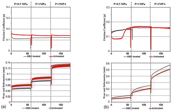 Tribological tests were performed for both treated and untreated specimen using a pin on disc tester under lubricated condition. The friction and wear response of both treated and untreated specimens of PA66 and PTFE were show in Figure 7a,b. It is evident from the figure that significant differences in tribological properties were observed between treated and untreated specimen for PA66 and PTFE specimen. In regards to the friction characteristics a clear running in phase with a transition to steady state was found for both materials (except for PTFE tested at 0.5 MPa contact pressure). For PA66 the coefficient of friction in case of treated specimen was found to be lower than the untreated in all loading conditions. However, the PTFE specimens show similar friction trend between treated and untreated specimen for 1 MPa and 2 MPa contact pressure. The decrease in friction characteristics in PA66 between the treated and the untreated is a consequence of a decrease in surface roughness (Sa decreases by 60%) where the smoothening increases the adhesion of lubricant to the contact surface. Additionally, the morphology with reduced peaks and increase base of individual asperity increases the adhesion characteristics. In case of PTFE the roughness vaguely decreases and the morphology remains the same and hence the difference in coefficient of friction between the treated and the untreated is rather limited. The asperity between the PTFE and the counterface increases as the consequence of increase in roughness. Hence one may conclude that the treatment in the PA66 favors low friction characteristics.