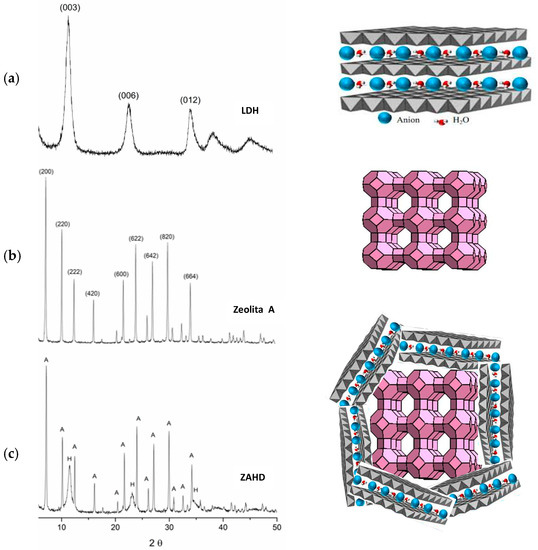 Diffractograms of the structure scheme of the synthesized materials: (a) LDH, (b) zeolite A, and (c) ZAHD composite.