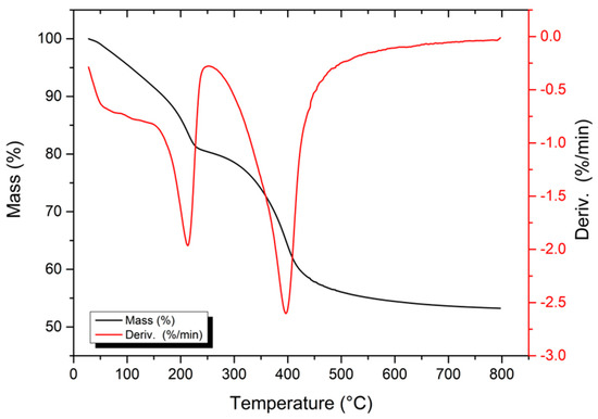 The prepared composite material was characterized by differential thermal and thermogravimetric analysis (DTG, DTA) under a dynamic nitrogen atmosphere with a flow rate of 20 mL min−1 at a heating rate of 10 °C·min−1 from 30 and 800 °C using a mass of approximately 10 mg deposited in a platinum sample port. The DTG curves were obtained by calculating the first derivative of the TG curves.