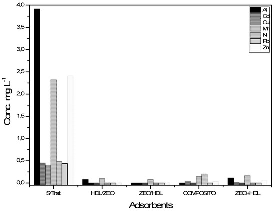 The initial concentrations of Al, Cd, Cu, Mn, Ni, Pb and Zn ions without the presence or action of adsorbents were 3.913 mg L−1, 0.448 mg L−1, 0.385 mg L−1, 2.319 mg L−1, 0.482 mg L−1, 0.437 mg L−1 and 2.407 mg L−1. The removal percentages obtained in the treatment performed by the composite were 99.2%, 95%, 100%, 85%, 100%, 100% and 98.8% for Al, Cd, Cu, Mn, Ni, Pb and Zn, respectively.